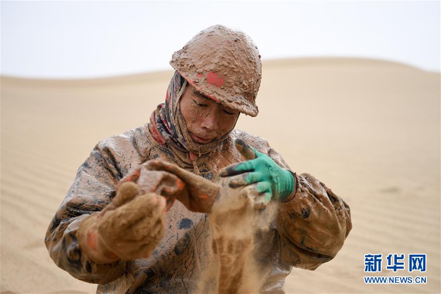 1月13日,鉆井工潘洪星用沙子帶出手套里的泥水。地球物理勘探是油氣開發(fā)的第一步,相當于給地球做CT。物探工人按照嚴格的測線部署,在相應(yīng)位置鉆井,然后實施地震,采集地震波數(shù)據(jù)。科研人員通過數(shù)據(jù)組成的“CT片”,就能夠清晰地“看”到地下的地質(zhì)結(jié)構(gòu),判斷哪里埋藏有石油或者天然氣。2019年10月,東方地球物理勘探有限責任公司塔里木物探處2113隊進入新疆塔克拉瑪干沙漠腹地,開始中古14-21、塔中2兩個區(qū)塊的三維地震勘探。近2000名物探工人將在1000平方公里的范圍內(nèi)一直工作到2020年4月,這也意味著他們將在塔克拉瑪干沙漠腹地連續(xù)度過第14個除夕夜。蘊藏著豐富石油天然氣資源的新疆塔克拉瑪干沙漠有“死亡之海”之稱,氣候干燥,年降水量在50毫米以下,冬季地表最低溫度超過零下30攝氏度,是世界油氣勘探難度最大的地區(qū)之一。為避開風季,物探工人每年9、10月份進入沙漠,一直工作到來年4月,夜以繼日與黃沙、嚴寒為伴,用辛勤的汗水,為祖國找油找氣。新華社記者丁磊攝