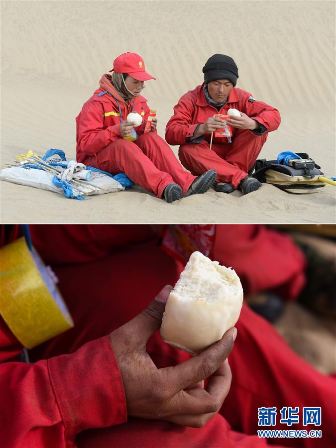 這是一張拼版圖片:上圖為測量工周國燕(左)和丈夫杞朝金在沙漠中解決午餐(1月13日攝);下圖為測量工周國燕在吃冰涼的饅頭(1月13日攝)。地球物理勘探是油氣開發(fā)的第一步,相當(dāng)于給地球做CT。物探工人按照嚴(yán)格的測線部署,在相應(yīng)位置鉆井,然后實(shí)施地震,采集地震波數(shù)據(jù)。科研人員通過數(shù)據(jù)組成的“CT片”,就能夠清晰地“看”到地下的地質(zhì)結(jié)構(gòu),判斷哪里埋藏有石油或者天然氣。2019年10月,東方地球物理勘探有限責(zé)任公司塔里木物探處2113隊(duì)進(jìn)入新疆塔克拉瑪干沙漠腹地,開始中古14-21、塔中2兩個(gè)區(qū)塊的三維地震勘探。近2000名物探工人將在1000平方公里的范圍內(nèi)一直工作到2020年4月,這也意味著他們將在塔克拉瑪干沙漠腹地連續(xù)度過第14個(gè)除夕夜。蘊(yùn)藏著豐富石油天然氣資源的新疆塔克拉瑪干沙漠有“死亡之?!敝Q,氣候干燥,年降水量在50毫米以下,冬季地表最低溫度超過零下30攝氏度,是世界油氣勘探難度最大的地區(qū)之一。為避開風(fēng)季,物探工人每年9、10月份進(jìn)入沙漠,一直工作到來年4月,夜以繼日與黃沙、嚴(yán)寒為伴,用辛勤的汗水,為祖國找油找氣。新華社記者丁磊攝