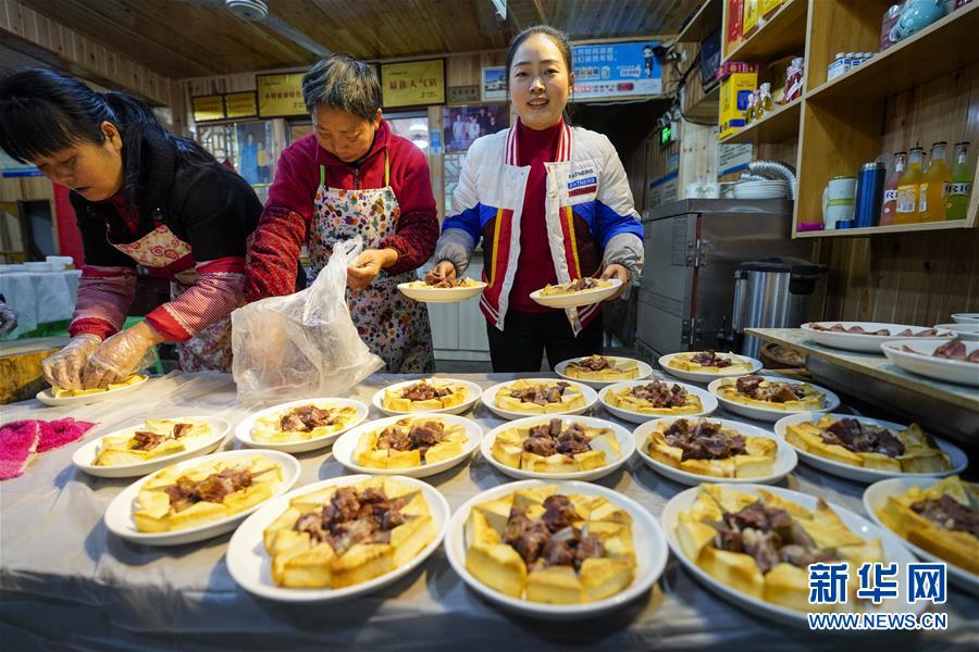 1月18日,中山古鎮(zhèn)的一戶(hù)商家在“千米長(zhǎng)宴”開(kāi)席前準(zhǔn)備菜品。新華社記者劉潺攝