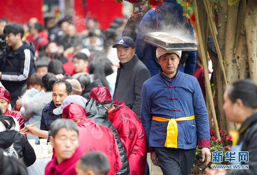 1月18日,在中山古鎮(zhèn)的“千米長宴”上,民間藝人用古鎮(zhèn)傳統(tǒng)“打盆”絕藝給游客們上菜。新華社記者劉潺攝