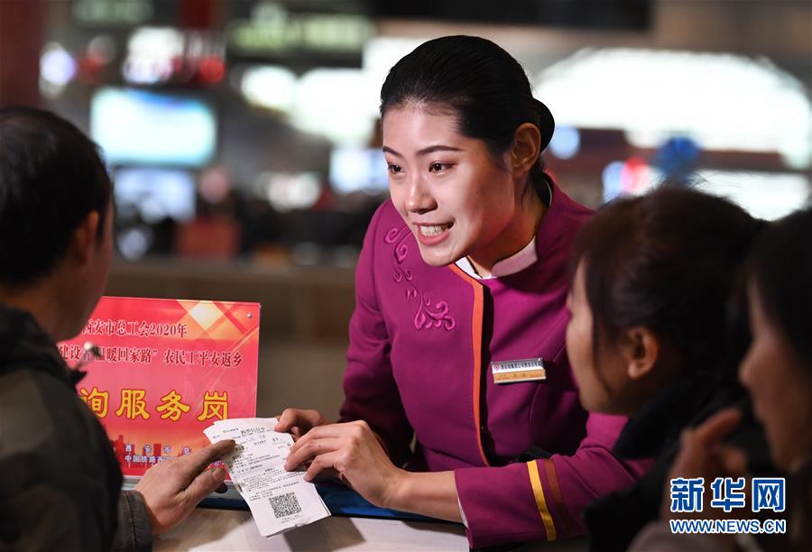 吉如在西安北站咨詢服務(wù)臺(tái)解答旅客的問題(1月15日攝)。新華社記者陶明攝