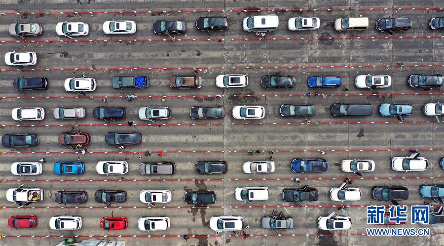 1月19日,車輛在海口秀英港輪渡碼頭等待登船(無人機照片)。 新華社記者 郭程 攝