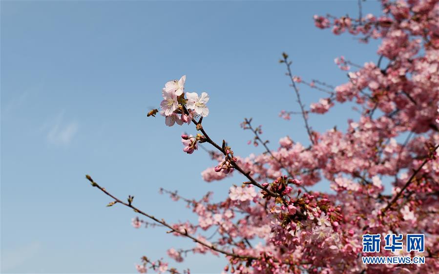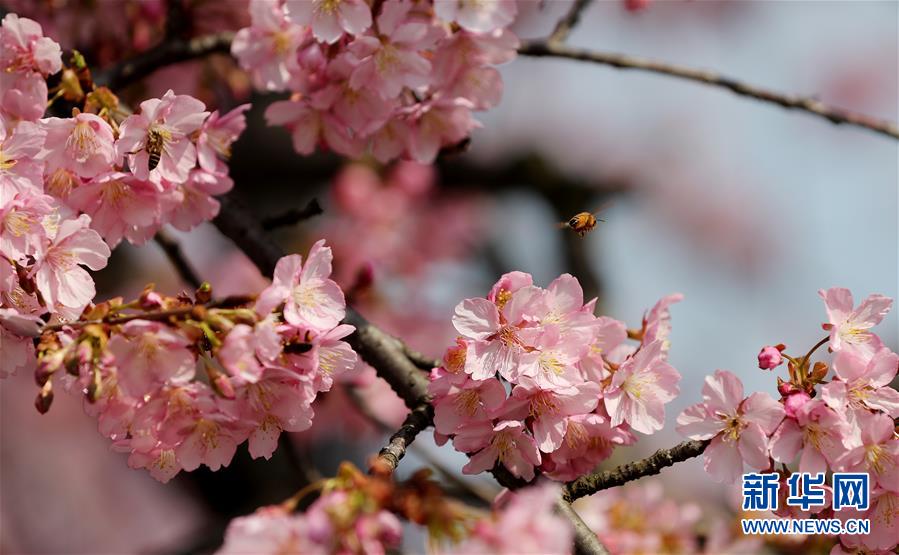 2月24日,蜜蜂在上海松江辰山植物園內(nèi)盛開(kāi)的河津櫻櫻花叢中飛舞。近日,上海松江區(qū)辰山植物園內(nèi)的河津櫻絢麗綻放,花團(tuán)錦簇間一派盎然春意。 新華社記者 方喆 攝