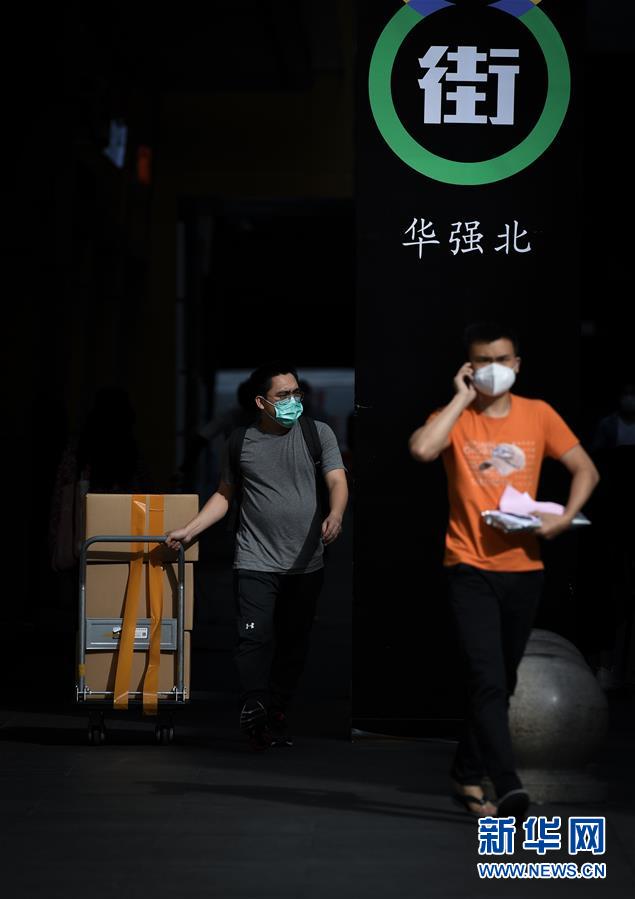 2月24日,在深圳華強北街頭,人們帶著口罩搬運貨物。 新華社記者 毛思倩 攝