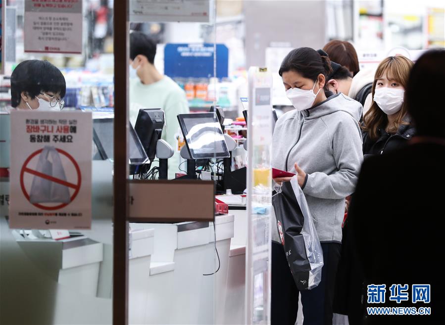2月24日,在韓國首爾,當(dāng)?shù)鼐用裨邶埳絽^(qū)一家日用品商店排隊(duì)結(jié)賬。 新華社記者 王婧嬙 攝