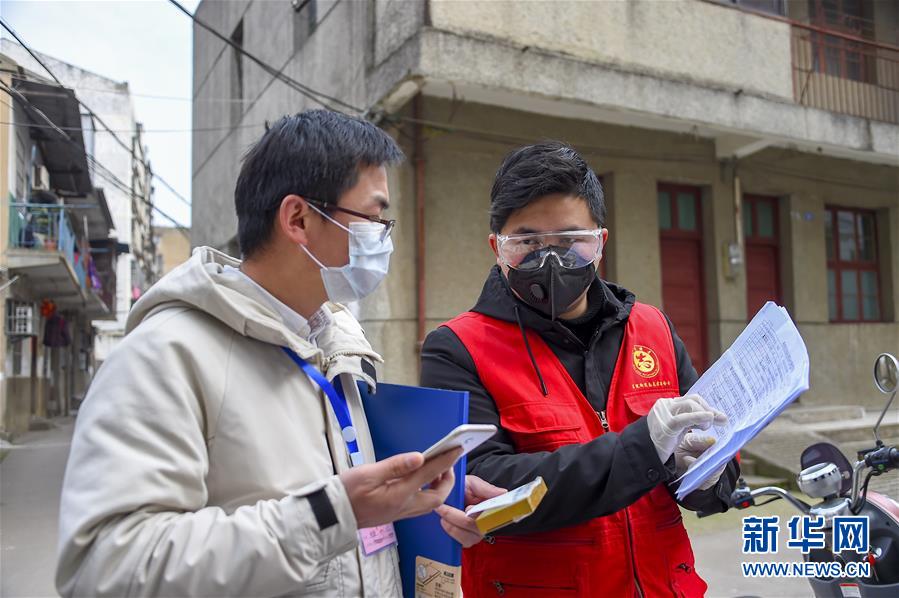 書院社區(qū)志愿者梁尚(右)和一名疫情防控工作人員溝通,通知居民下樓取藥(2月23日攝)。 新華社記者 胡虎虎 攝