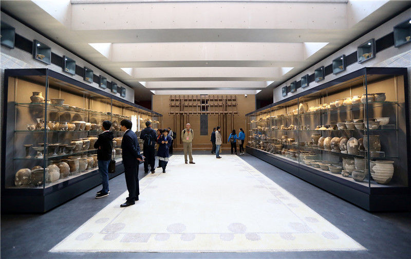 參觀者在二里頭夏都遺址博物館觀看展出的陶器(2019年10月19日攝)。新華社記者李安攝