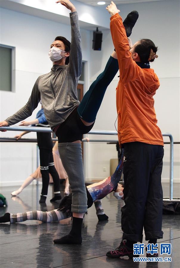 2月29日,在通過網(wǎng)絡(luò)直播的“公益公開課”上,上海芭蕾舞團(tuán)團(tuán)長(zhǎng)辛麗麗(前右)在指導(dǎo)團(tuán)員。新華社記者任瓏攝