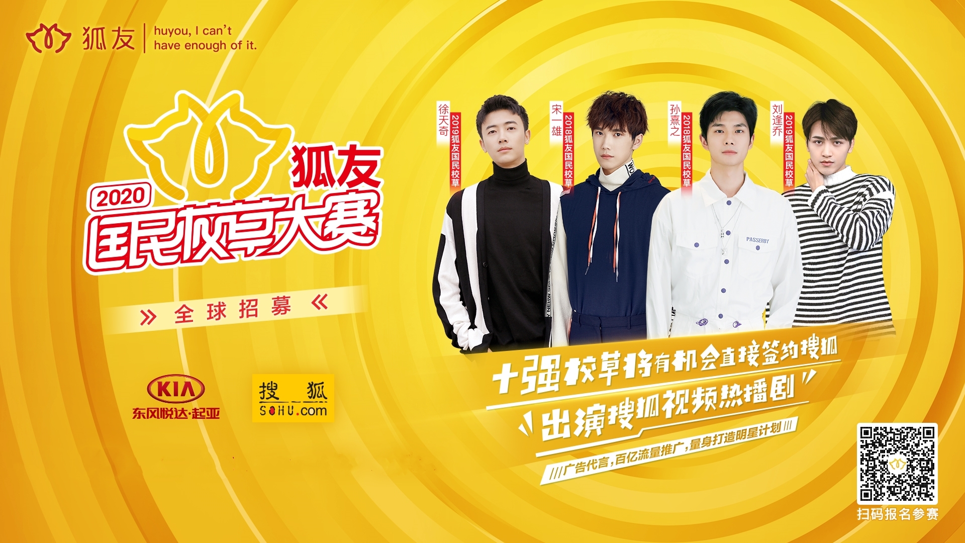 2019年,搜狐“考察”校草的維度更加嚴格且多元,推廣渠道也更加豐富,成功簽約的劉逢喬、徐天奇兩位“校草”,已成為2020年度“東風悅達起亞”的形象大使,影視資源也在進一步對接過程中。