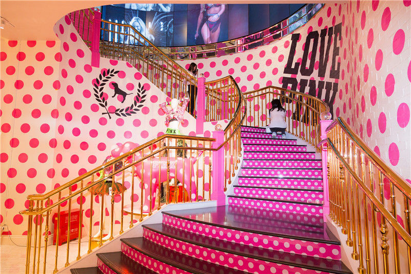 2018年5月17日,北京王府井維密旗艦店。店內(nèi)旋梯很漂亮,上下一共3層,1、2層巨大的環(huán)形電視墻,播放著維密超模走秀的視頻,地下一層粉嫩的風(fēng)格粉嫩,充滿了少女心。劉鋒/千龍圖像/視覺中國