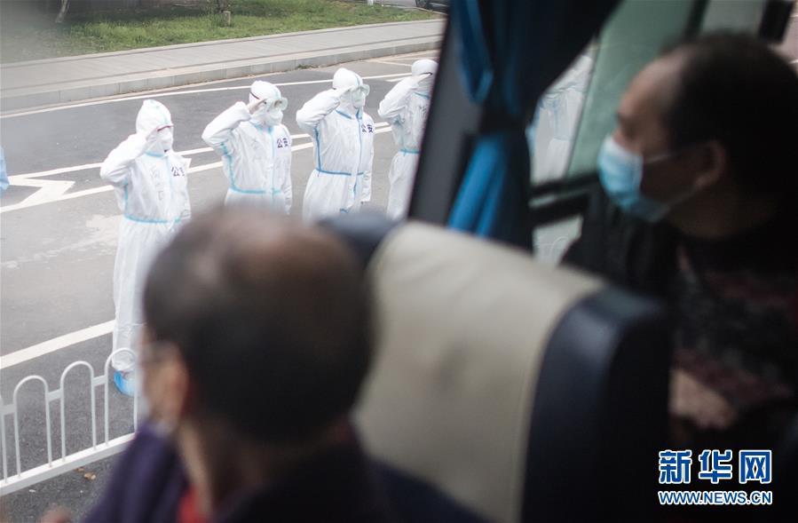 3月12日,臨出發(fā)前,公安民警向車(chē)上的治愈患者敬禮。 3月12日,插畫(huà)師黎婧和84位病友離開(kāi)自己居住的武漢軟件工程職業(yè)學(xué)院康復(fù)驛站,回到自己家中。他們都是治愈出院的新冠病毒肺炎患者,已經(jīng)在武漢軟件工程職業(yè)學(xué)院康復(fù)驛站進(jìn)行了14天醫(yī)學(xué)觀(guān)察,達(dá)到醫(yī)學(xué)標(biāo)準(zhǔn),成功解除隔離。他們由專(zhuān)車(chē)運(yùn)送至所屬社區(qū)附近的集散點(diǎn)后,在社區(qū)工作人員的陪同下回家。 新華社記者 肖藝九 攝