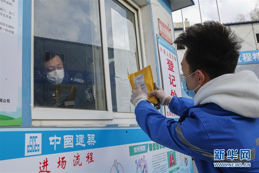 3月12日,李杰(右)在一個投遞點向傳達室工作人員詢問收件人的信息。新華社記者張玉薇攝