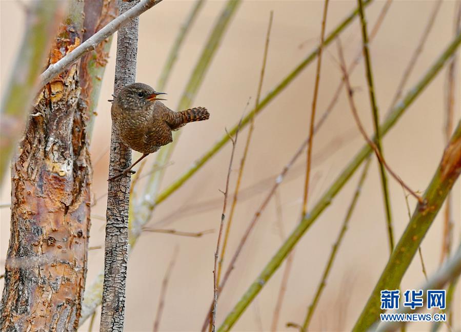 3月14日,一只小鳥在拉魯濕地的樹上鳴叫。新華社記者張汝鋒攝