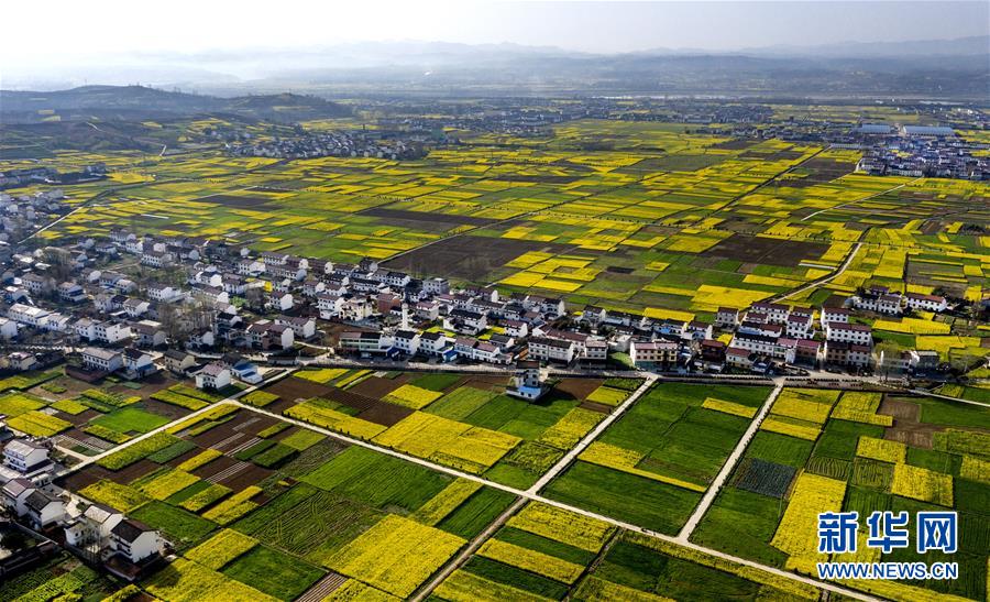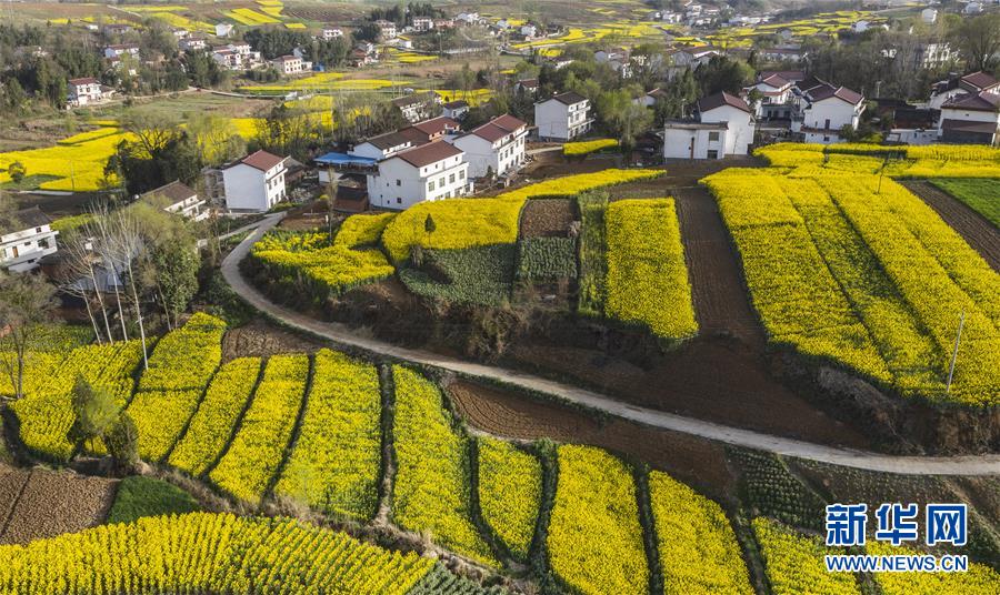 3月14日,洋縣龍亭鎮(zhèn)柳山村盛開的油菜花與村舍構成美麗的圖畫(無人機照片)。 新華社記者陶明攝