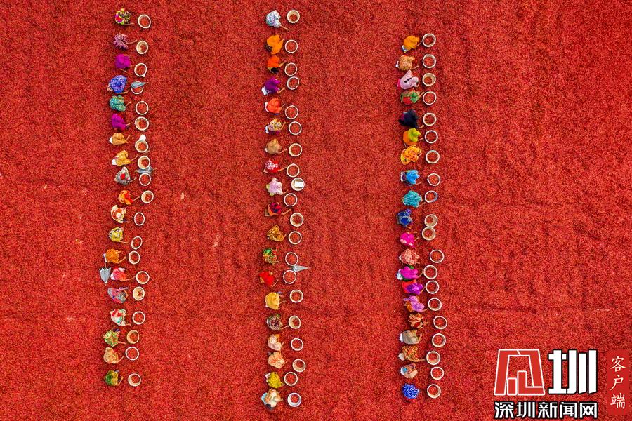 航拍孟加拉國(guó)工人分揀辣椒 滿眼火紅大地如鋪上地毯