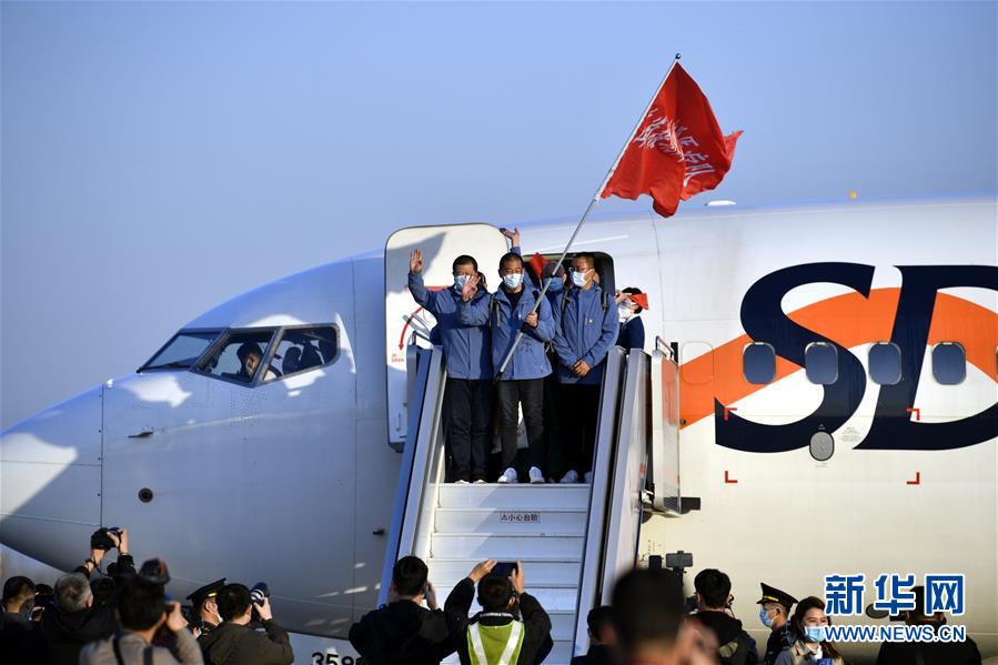 3月17日,醫(yī)療隊(duì)隊(duì)員抵達(dá)山東濟(jì)南遙墻國際機(jī)場。新華社發(fā)(饒琦攝)