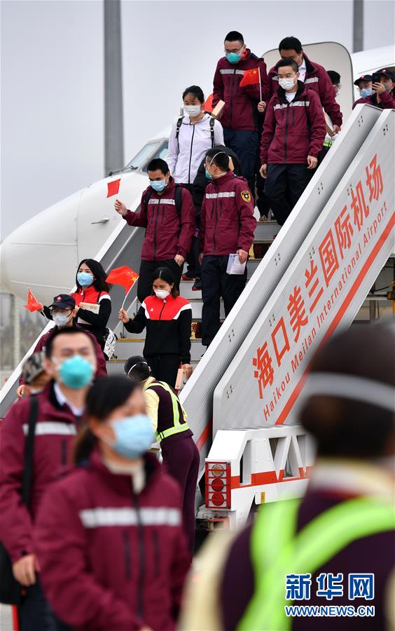 3月17日,醫(yī)療隊(duì)隊(duì)員抵達(dá)海南??诿捞m國際機(jī)場。新華社記者郭程攝