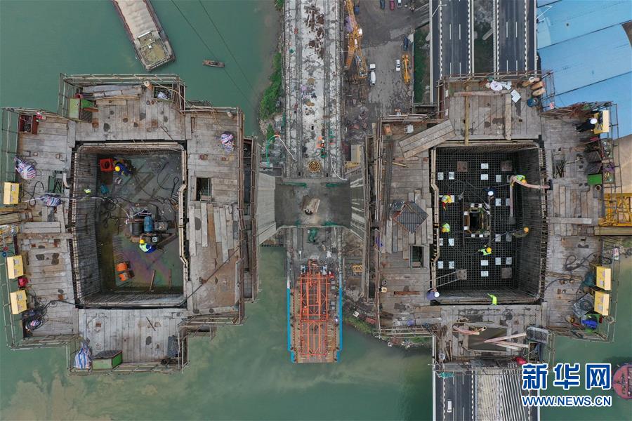 廣州南沙港鐵路跨西江斜拉橋主塔封頂