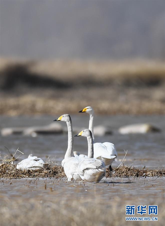 3月18日,候鳥在準(zhǔn)格爾旗大路鎮(zhèn)的黃河淺灘上棲息。 新華社記者 劉磊 攝
