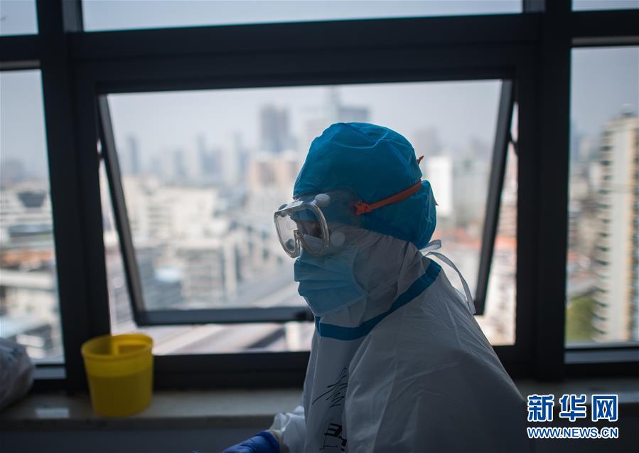 3月19日,在武漢市肺科醫(yī)院隔離病房,海南醫(yī)療隊(duì)隊(duì)員詹才露在現(xiàn)場(chǎng)忙碌。 新華社記者 肖藝九 攝