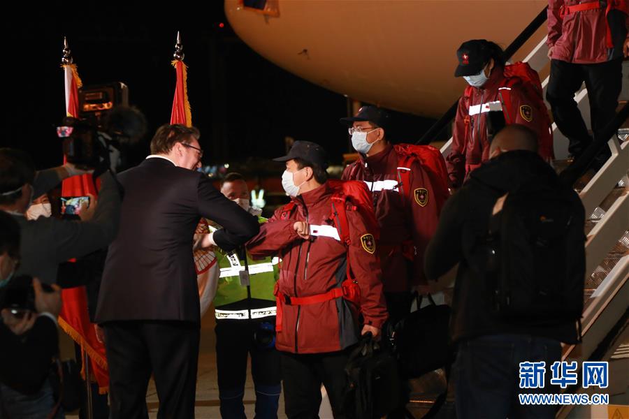 3月21日,在塞爾維亞首都貝爾格萊德,前來迎接的塞爾維亞總統(tǒng)武契奇(左)與中國援助塞爾維亞抗疫醫(yī)療專家組成員“碰肘”致意。 中國援助塞爾維亞抗疫醫(yī)療專家組一行6人21日晚乘專機(jī)抵達(dá)塞首都貝爾格萊德,由中國政府捐贈的一批醫(yī)療物資同機(jī)抵達(dá)。 新華社記者 石中玉 攝