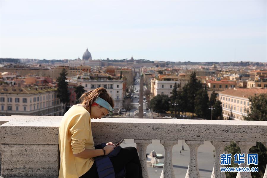 3月10日,在意大利首都羅馬,一名女子在蘋丘坐著休息。新華社記者程婷婷攝