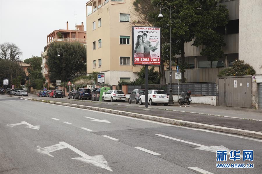 這是3月14日在意大利首都羅馬拍攝的空蕩蕩的街道。新華社記者劉詠秋攝