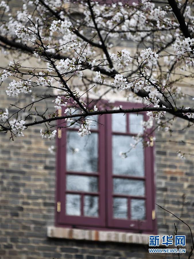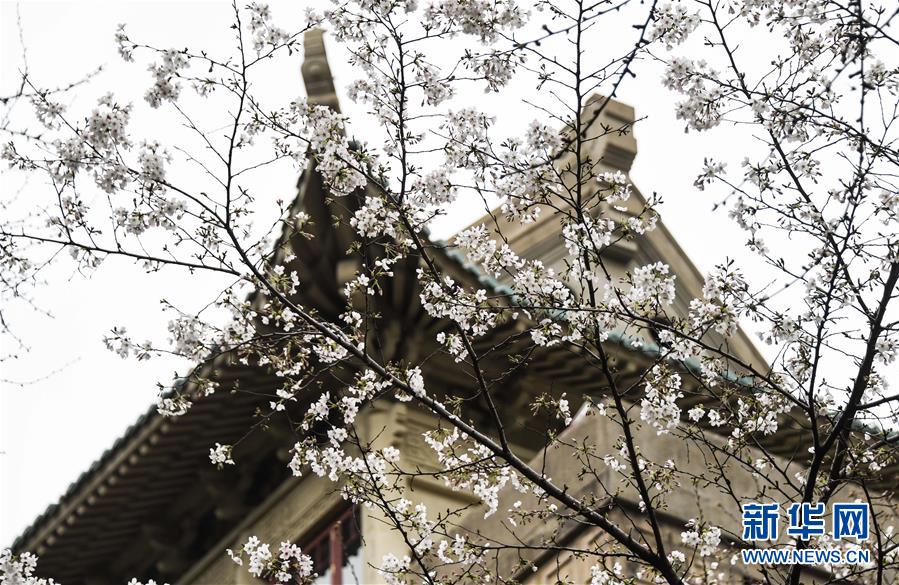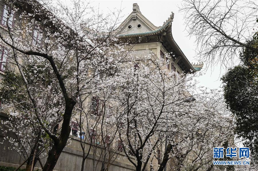 近日,隨著氣溫上升,武漢大學(xué)圖書館附近一片櫻花開放。新華社記者費(fèi)茂華攝