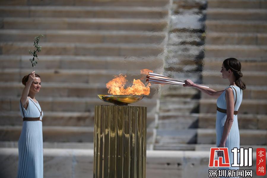 3月19日,扮演最高女祭司的希臘女演員桑西·喬治烏(右)從圣火盆中點(diǎn)燃火炬。