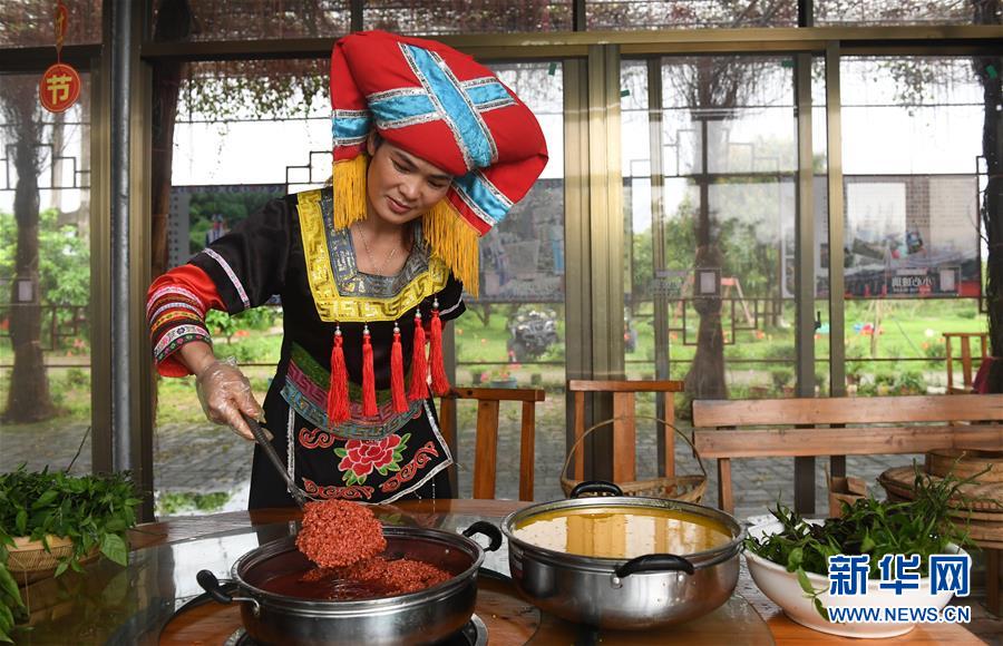 4月16日,在貴州省臺(tái)江縣姊妹街哆蝶五彩姊妹飯?bào)w驗(yàn)店,苗家婦女在制作五彩“姊妹飯”。新華社發(fā)(劉開福攝)