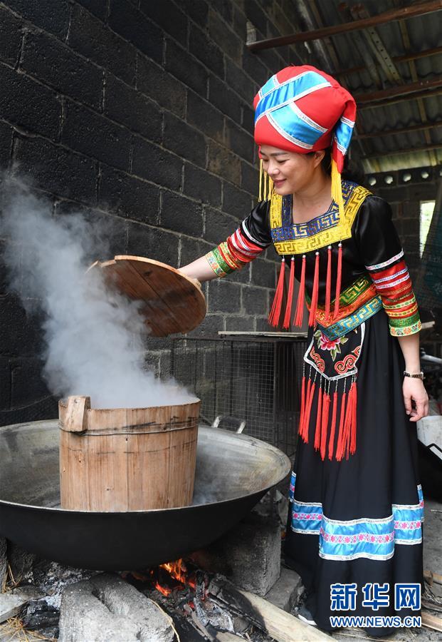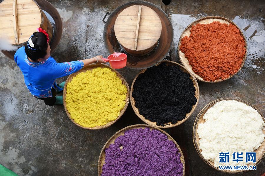 4月17日,在貴州省臺(tái)江縣姊妹街哆蝶五彩姊妹飯?bào)w驗(yàn)店,苗家婦女在蒸煮五彩“姊妹飯”。新華社記者楊文斌攝