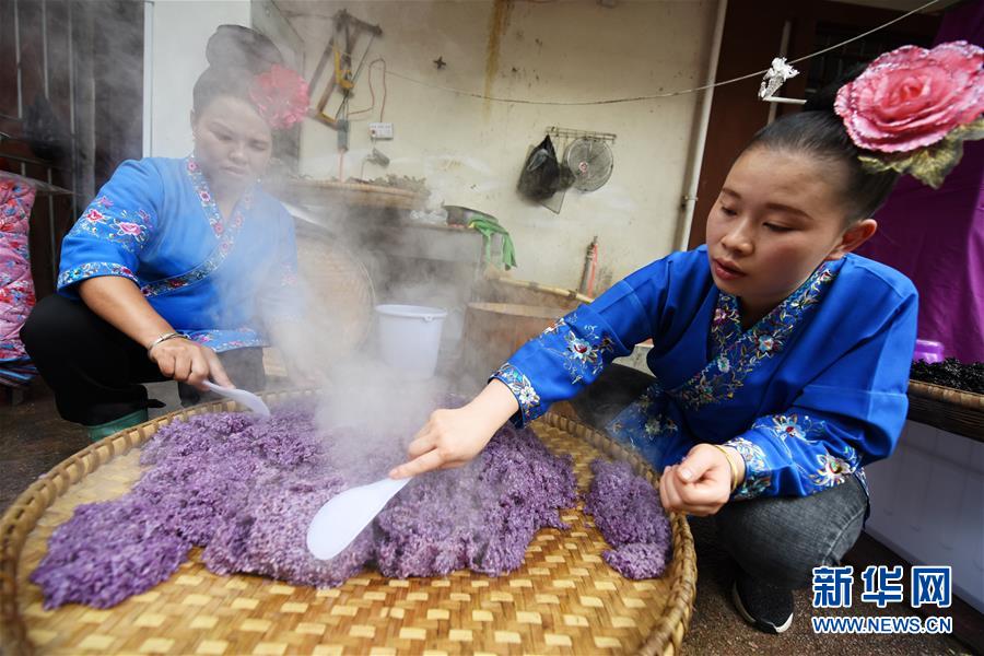 4月17日,在貴州省臺(tái)江縣姊妹街哆蝶五彩姊妹飯?bào)w驗(yàn)店,苗家婦女將蒸熟的五彩“姊妹飯”進(jìn)行攤晾。新華社記者楊文斌攝