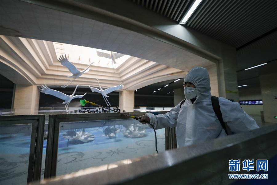 3月23日,在漢口火車站地鐵站,保潔人員在為站廳乘客通道消毒。目前,武漢城市功能和市民生活正逐步有序恢復(fù),地鐵、公交車系統(tǒng)已啟動全面消殺和張貼乘客健康二維碼識別等舉措,為恢復(fù)運營做準(zhǔn)備。新華社記者沈伯韓攝