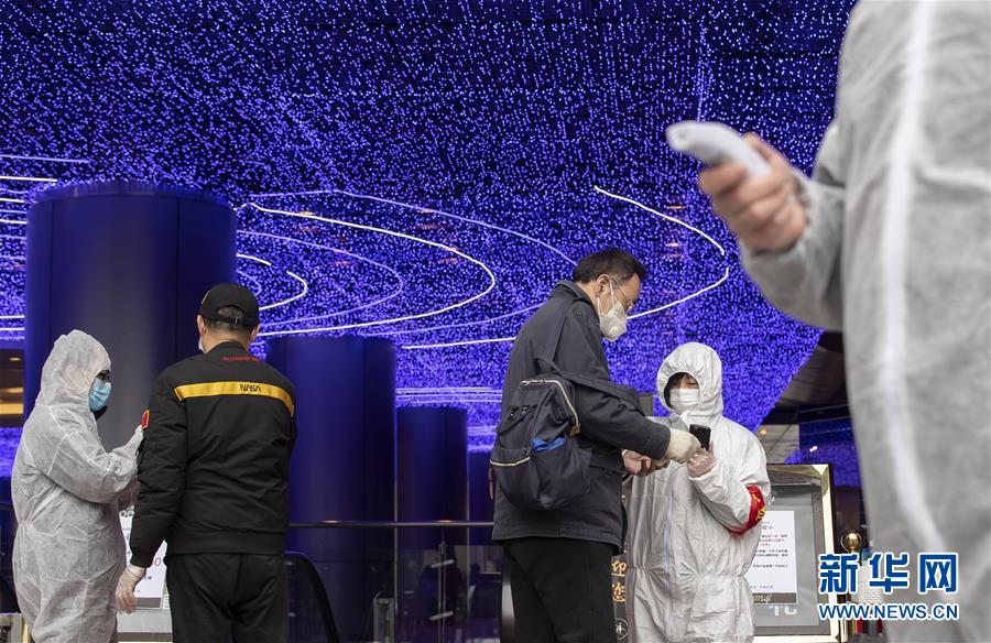 3月30日,在武商國際廣場的超市前,工作人員測量顧客的體溫、查看健康碼。當日,武漢市多家商場開門迎客。新華社記者費茂華攝