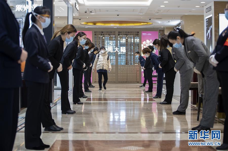 3月30日,在武商世貿(mào)廣場,工作人員歡迎顧客進入。當(dāng)日,武漢市多家商場開門迎客。新華社記者費茂華攝