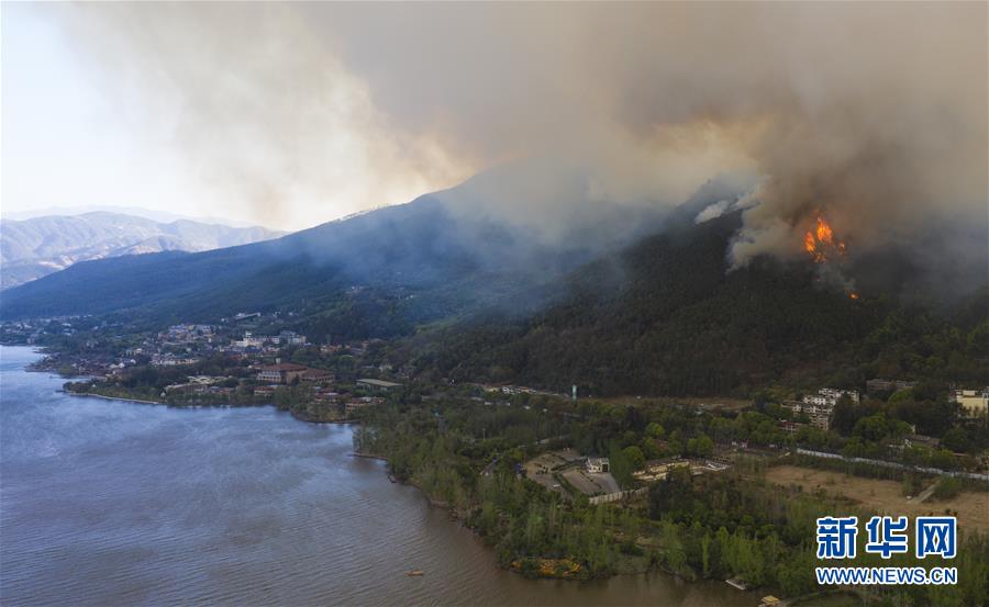 這是3月31日在四川省西昌市邛海畔拍攝的瀘山火場畫面。新華社記者惠小勇攝