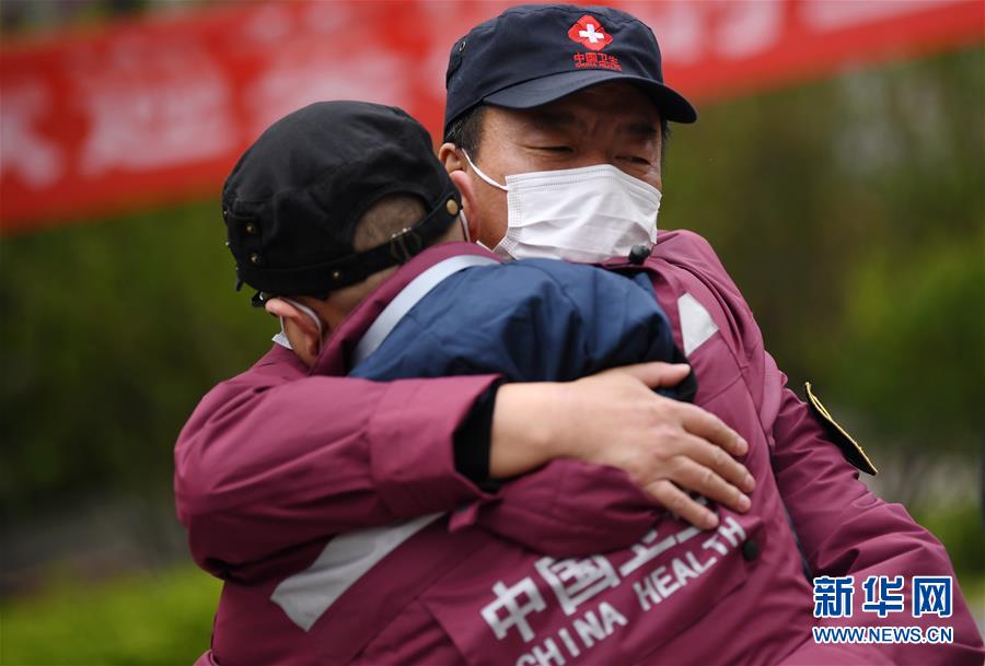 4月3日,陜西省第一批援鄂醫(yī)療隊(duì)隊(duì)長易智(右)和隊(duì)員擁抱作別。 當(dāng)日,陜西省第一批援鄂醫(yī)療隊(duì)137名隊(duì)員在陜西省工人療養(yǎng)院結(jié)束了為期兩周的隔離休養(yǎng)。醫(yī)療隊(duì)員與“戰(zhàn)友”深情作別后,陸續(xù)踏上歸途。 新華社記者 李一博 攝