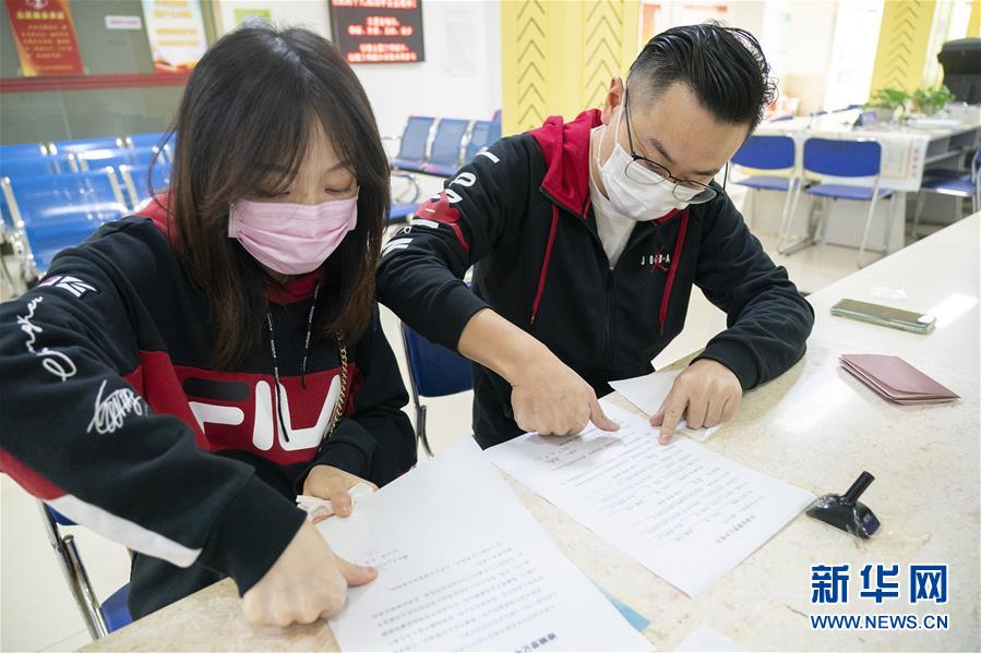 4月7日,在武漢市江岸區(qū)民政局婚姻登記處,工作人員為新人陳先生與張女士辦理結(jié)婚登記手續(xù)。 新華社記者才揚(yáng)攝