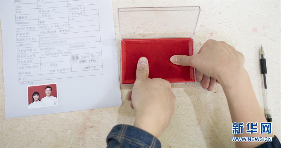 4月7日,在武漢市江岸區(qū)民政局婚姻登記處,新人辦理結婚手續(xù)時按手印。 新華社記者才揚攝