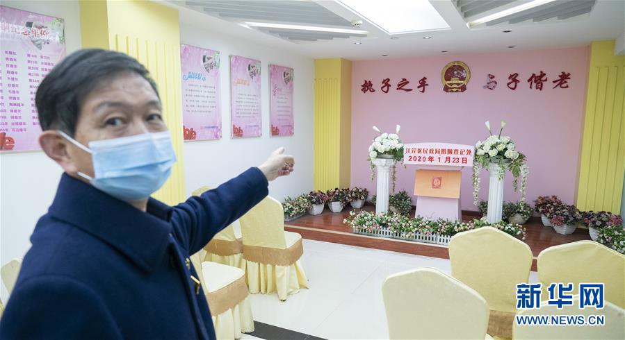 4月7日,武漢市江岸區(qū)民政局婚姻登記處工作人員介紹頒證廳,疫情期間這里暫停使用。 新華社記者才揚攝