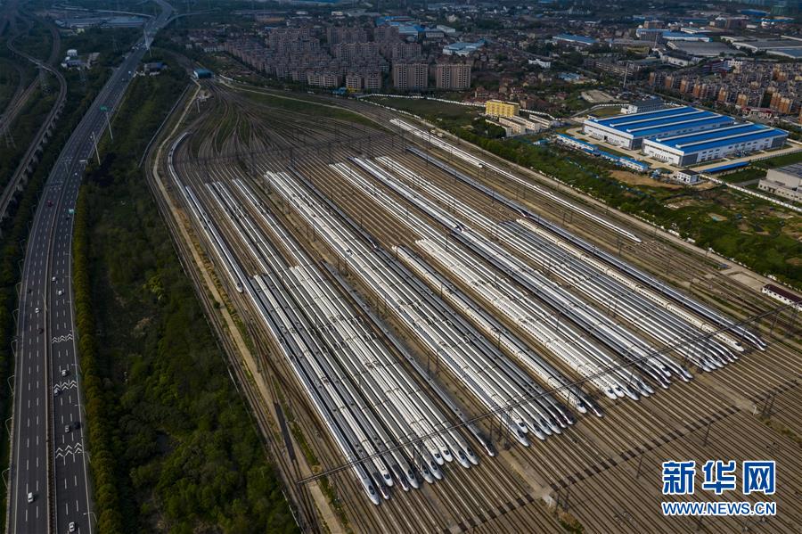 4月7日,在武漢動(dòng)車段,列車??吭诖孳嚲€上(無人機(jī)照片)。新華社記者 沈伯韓 攝