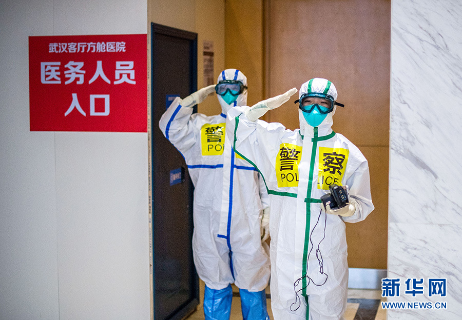 2月25日,在武漢客廳方艙醫(yī)院,來自武漢市東西湖區(qū)公安分局的民警張錦星(右)與同事劉晨在進(jìn)方艙前向同事敬禮。 新華社記者 肖藝九 攝