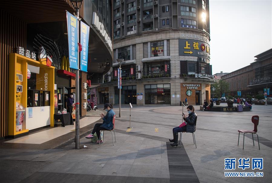 4月8日,顧客在江漢路步行街一家甜品店門前排隊(duì)。新華社記者肖藝九攝