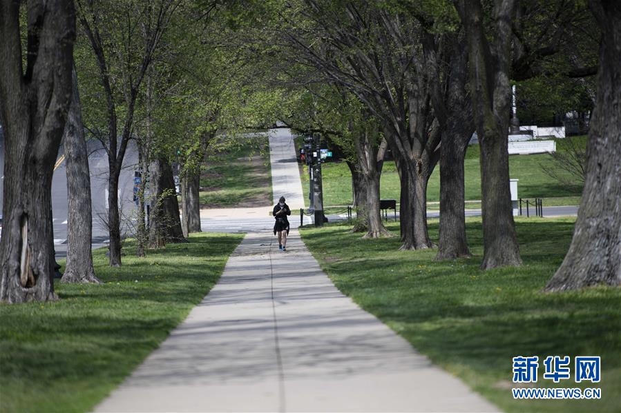 4月8日,在美國首都華盛頓,一名戴口罩的男子行走在空曠的步行道上。新華社記者劉杰攝