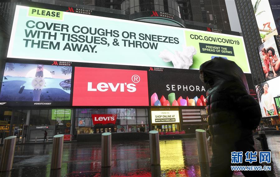 3月23日,在美國紐約時(shí)報(bào)廣場(chǎng),大屏幕上播放防控新冠肺炎的知識(shí)。新華社記者王迎攝