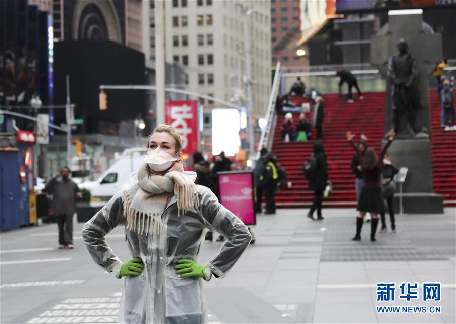 3月19日,一名戴口罩的女子在美國紐約曼哈頓時(shí)報(bào)廣場(chǎng)拍照。新華社記者王迎攝
