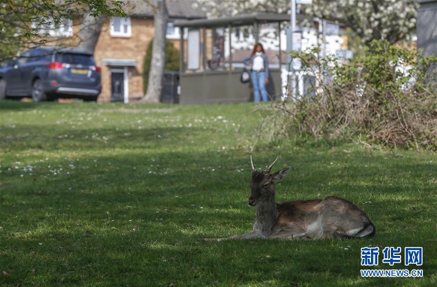 4月8日,在英國倫敦東部一個(gè)居民區(qū),附近公園里的鹿在草坪上休息。隨著新冠疫情在英國的擴(kuò)散,政府要求人們減少不必要的外出。倫敦東部一個(gè)居民區(qū)附近公園里原來散養(yǎng)的鹿紛紛從公園走出來,或吃草或接受附近居民的喂食,成為特殊時(shí)期居民區(qū)里的新“客人”。新華社記者韓巖攝