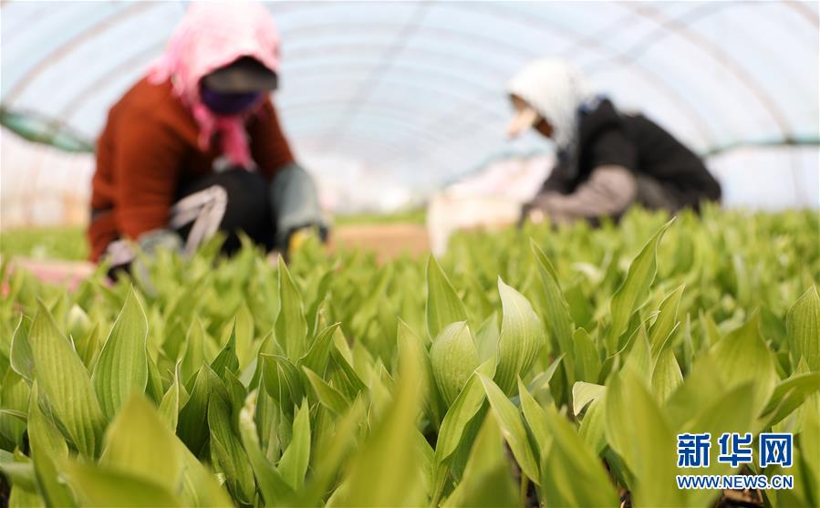 4月13日,在八角臺街道雅化村花圃內,花農為宿根花卉除草。新華社記者姚劍鋒攝