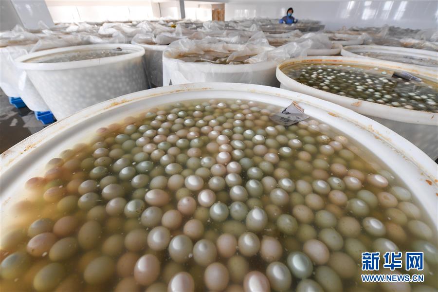 在江蘇高郵鴨集團(tuán)生產(chǎn)車間,腌制好的鴨蛋準(zhǔn)備進(jìn)行清洗包裝作業(yè)(4月15日攝)?!案哙]鴨蛋”是江蘇高郵的特色農(nóng)業(yè)名片。近年來,當(dāng)?shù)卦诹挤N繁育、生態(tài)養(yǎng)殖、產(chǎn)品加工等方面加大力度,推動高郵鴨蛋品牌化建設(shè),讓小鴨蛋成為帶動農(nóng)戶致富的大產(chǎn)業(yè)。2019年,高郵市共計(jì)生產(chǎn)熟制鴨蛋產(chǎn)品近11.2億枚,年產(chǎn)值近17.68億元。新華社記者李博攝