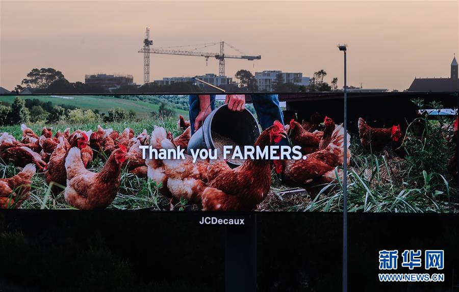 4月15日,在澳大利亞悉尼,戶外廣告牌上打出“感謝農(nóng)場(chǎng)工作者”的字樣,感謝在疫情期間工作的人們。新華社記者白雪飛攝